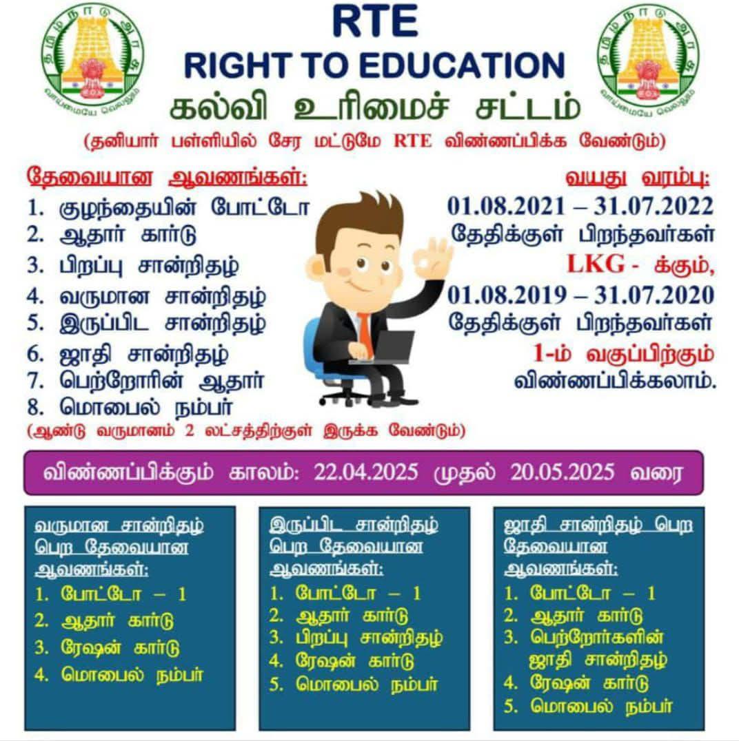 எல். கே. ஜி. முதல் எட்டாம் வகுப்பு வரை ஆர்.டி.இ. இலவச கல்வி சேவை